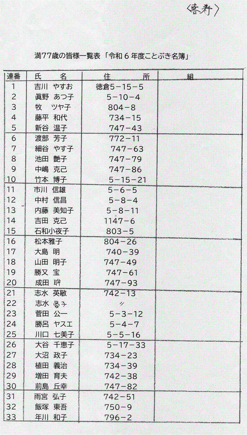 令和6年度ことぶき名簿 喜寿